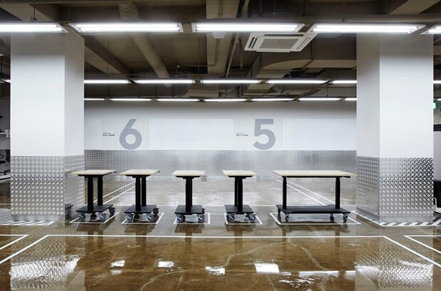 저기 밖에 있는 데스크 보이시죠? 저게 목업실에서 사용하는 높이 조절 작업대예요. 배터리 타입으로 되어서 선이 없어요. 어디서든 마음대로 쓸 수 있는 거예요. 요즘은 지하에서 작업하다가 통째로 업무층으로 가져와서 쓰기도 해요. 의도한 바와 다르게 새로운 방식으로 쓰는 경우가 생기죠. 이렇게 사용할 수도 있다는 걸 알게 되면 그런 아이디어가 전부 신제품 개발로 연결돼요.