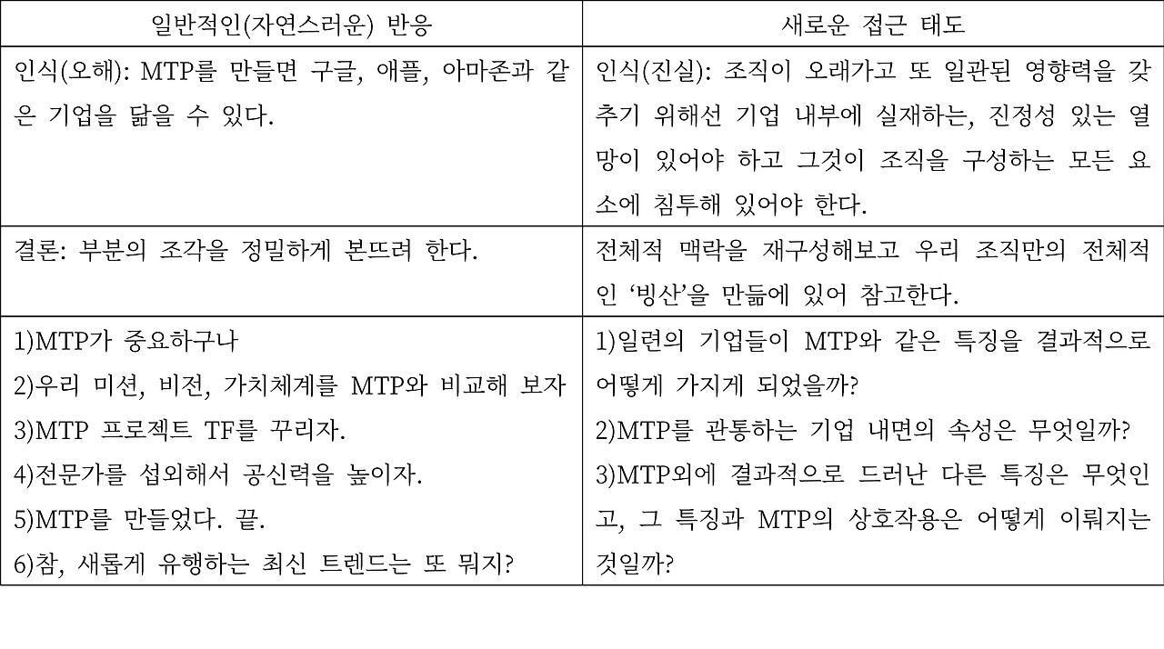 하지만 결과적으로 베스트 케이스를 추출하고 그 안에서 핵심 법칙을 정리해 제시하는 방식은 때때로 의도와 상반되는 방향으로 독자들을 이끄는 부작용을 낳습니다. (이는 다시 한번 강조하지만 우리의 책, 메시지도 마찬가지다.) 이를 테면 ‘MTP’가 중요하다는 내용은 기업과 기업 담당자, 그리고 이에 감명받은 다수의 경영 컨설턴트에게 ‘MTP 프로젝트’를 시작할 강력한 명분을 제공합니다.