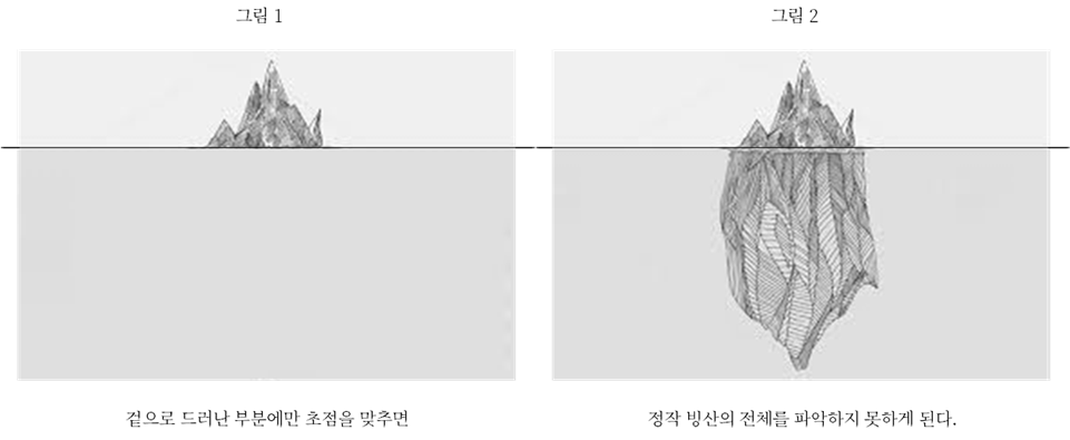 이를 좀 더 쉽게 설명하자면 우리는 보통 수면 위로 드러난 빙산의 조각을 보고 그 것이 곧 빙산의 전체인 마냥 그 조각을 정확하고 정밀하게 본뜨려 합니다. 하지만 우리가 정작 추구해야 할 것은 그림 2와 같은 빙산의 전체를 파악하려 하는 것이다. 빙산의 전체를 파악하는 태도 역시 드러난 모습을 세밀하게 분석하고 잘게 쪼개어 다시 조합하는 방식이 아니라 가능한 그 조직이 가진 고유의 프랙탈을 종합적인 시각에서 발견하고 그 프랙탈이 조직이라는 빙산(전체)를 어떻게 이끌어 왔고 또 이끌고 있는지 일련의 과정과 그 과정에서 다양한 구성요소의 상호작용을 추적하는 방식이 되어야 합니다. (참고 글: 복잡한 세상을 이해하는 과학적 실마리, 프랙탈-호모디그누스 X 초개인주의 중)