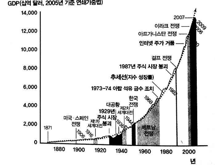 1800년 이래로 미국 GDP 성장률로 나타낸 도시화에 수반된 사회경제의 급성장. 많은 위기와 호황, 불황을 겪었지만 순수한 지수적인 실선은 이 추세를 아주 잘 묘사합니다.