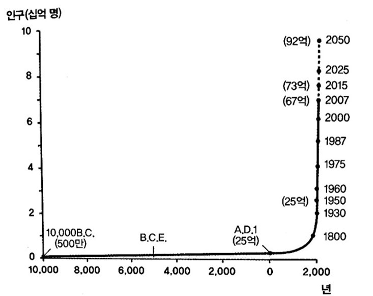 약 1만년전 이래로 세계 인구는 지수적으로 성장했습니다. 1800년경 시작된 폭발적인 성장은 산업혁명과 도시화의 시작을 알립니다.