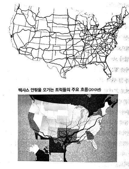 그림 위- 미국 국가주간방위고속도로체계National System of Interstate and Defense Highways의 모습 / 아래- 텍사스 교통흐름 지도: 물리적인 도로체계에 숨겨져 있는 프랙탈 구조를 드러낸다. 도록의 폭은 상대적인 교통 흐름을 나타낸 것입니다.[vi]