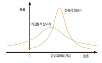 오픈 이노베이션 채널 등을 통해 조직 안팎으로 다양성을 확대했을 때, ‘평균적’인 관점에서는 기존 전통적인 전문가에 비해 비 전통적인 참가자들의 성과는 저조합니다. 하지만 결과적으로 비 전통적인 참가자 중 ‘가장 뛰어난’ 아이디어가 기존의 전통적인 접근 방식을 뛰어넘을 가능성은 얼마든지 있습니다.
