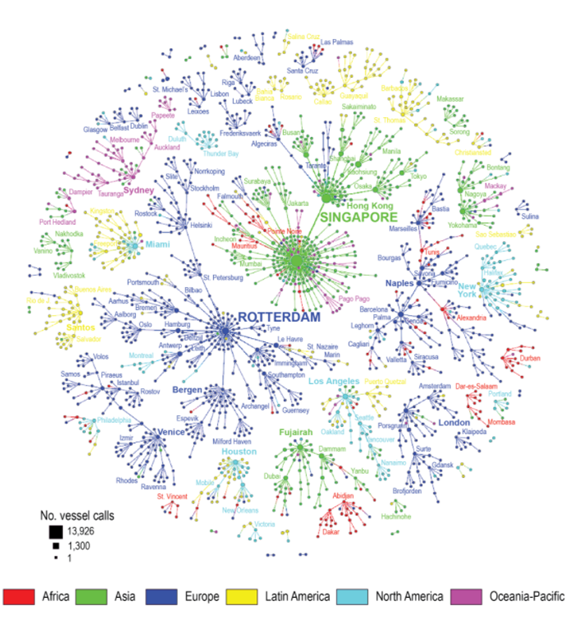 『Globalization, regionalization, urbanization: an analysis of the worldwide maritime network』, 2004