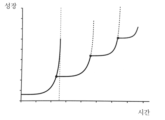 [그림] 연속적인 초선형 성장 궤적을 보여주는 그래프, 동시에 도시적 기업이 지향하는 성장 궤적: 유한 시간 특이점(수직 점선)에 다다르기 전 혁신이 이뤄지지 않는다면 각 성장궤도는 특이점에 다다랐다가 붕괴로 이어질 수 있다** 때문에 도시는, 그리고 도시적 기업은 혁신의 시간을 다시 맞춤으로써 전체 주기를 새롭게 개시하는 형태로 초선형 성장을 유지하려 합니다.