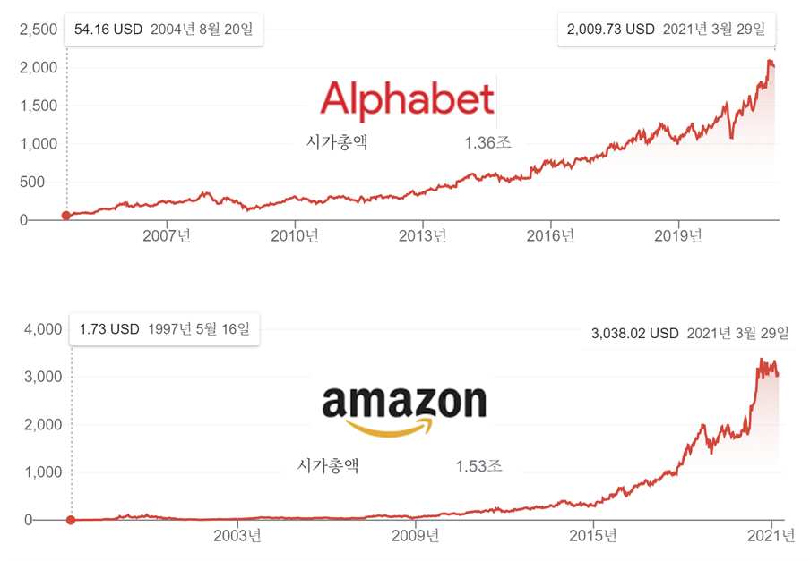 시가총액을 기준으로 볼 때 두 회사모두 20여년 동안에 걸쳐 초선형적 성장세(Exponential Growth)를 보여주고 있습니다.