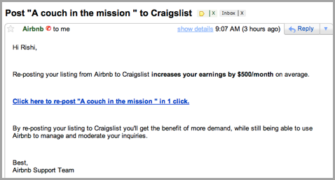 당시 에어비앤비가 고객에게 보낸 이메일: 에어비앤비에 숙박 관련 포스팅을 올리면 에어비앤비가 제작한 프로그램을 통해 자동으로 에어비앤비로부터 위 이미지 같은 이메일을 받게 됩니다. 에어비앤비는 이메일에 “클릭 한 번으로” 크레이그리스트에 광고를 올리면 “매달 500불의 추가 이익”을 얻을 수 있다고 홍보합니다. 이에 설득된 사용자들이 이메일 내의 링크를 클릭하면 에어비앤비가 만든 소프트웨어에 의해 에어비앤비에 올린 본인의 포스팅이 자동으로 크레이그리스트에 등록이 됩니다.