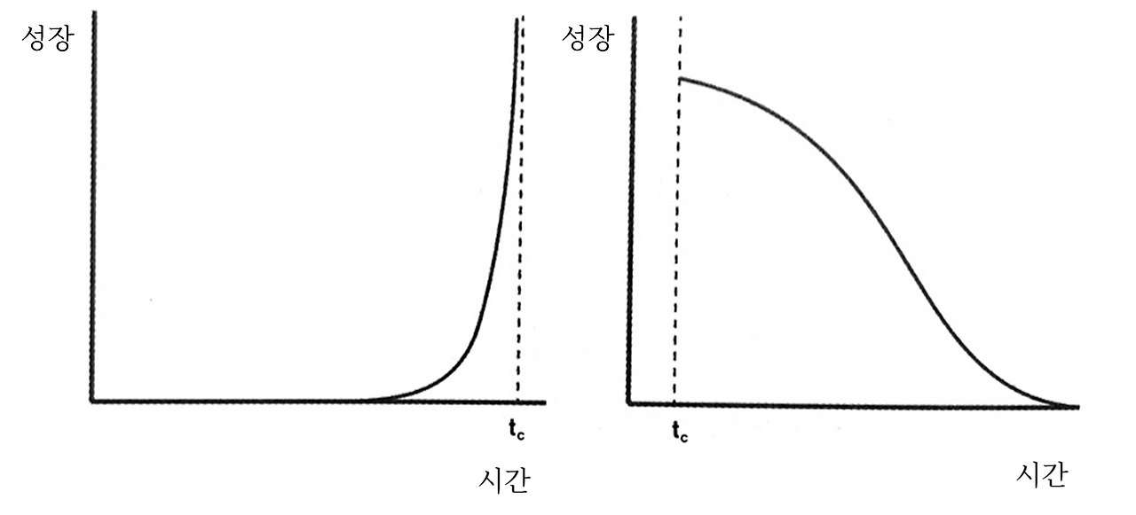 저선형 성장과 초선형 선장이 다른 점이 있습니다. 초선형적 스케일에서 성장은 수직 점선으로 나타낸 유한 시간(t0)에 무한해집니다. 유한시간 특이점이 존재한다는 것은 그 시점에 불가피한 변화가 일어날 것이고 아마도 문제가 생길 것임을 알려주는 신호입니다. 쉽게 말하면 유한 시간 특이점은 초선형 성장을 하는 인구든, GDP든, 특허 건수든 해당 대상을 통제하는 성장 방정식의 수학적 해가 어떤 유한한 시간에 무한히 커진다는 것을 의미합니다.(그림 참조) 그런데 현실에서 그런 일은 지속 불가능합니다. 무제한적으로 계속 증가해야 하는데 현실 세계에서 에너지와 자원의 공급은 끝내 유한할 것이기 때문입니다. 이 이론은 이를 그냥 내버려두면 결국 이 특이점에서 상전이가 일어나면서 침체와 붕괴로 이어진다고 예측됩니다.