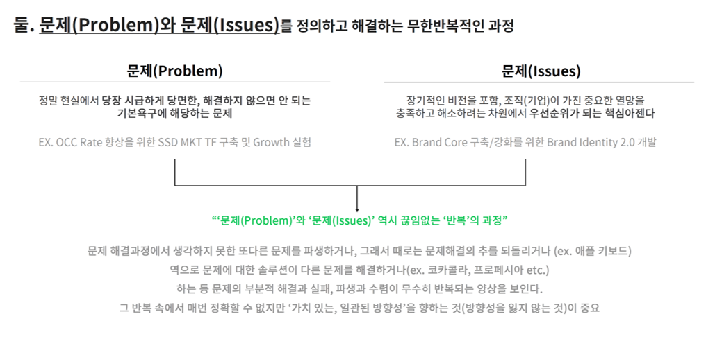 단 여기서 말하는 ‘문제’란 정말 현실에서 당장 시급하게 당면한, 해결하지 않으면 안 되는 기본욕구에 해당하는 문제(problem) 만을 의미하는 것은 아닙니다. 인간은 끝없는 욕구의 동물이기에 가장 단순한 생리적 욕구부터 고차원적인 자아실현의 욕구까지 수많은 욕구를 충족하고 해소하려는 차원에서 ‘문제issue’- 논의의 대상이 될 수 있는 주제 - 를 적극적으로 찾고 이에 개인, 조직, 기업 고유의 해석을 더합니다. 그런 차원에서 목표관리는 곧 우리의 가득한, 그리고 다양한 층위의 욕구를 포괄적으로 이슈화, 문제 정의하고 해결하는 과정이기도 합니다.