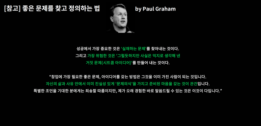 미국 실리콘밸리에 위치한 스타트업 육성 및 투자 회사 Y컴비네이터Y Combinator 설립자로 미 스타트업 시장의 구루로 불리는 폴 그레이엄Paul Graham의 말입니다. 그는 스타트업을 시작함에 있어 가장 중요하면서도 위험한 것이 ‘문제’를 정의하는 것이라 강조한다. 그에 따르면 성공에 가장 중요한 것은 ‘실재하는 문제’를 찾는 것입니다. 그리고 가장 위험한 것은 ‘그럴듯하지만 사실은 억지로 생각해낸 거짓 문제’를 만들어 내는 것입니다. 그는 이를 ‘시트콤 아이디어’* 라 부릅니다.
