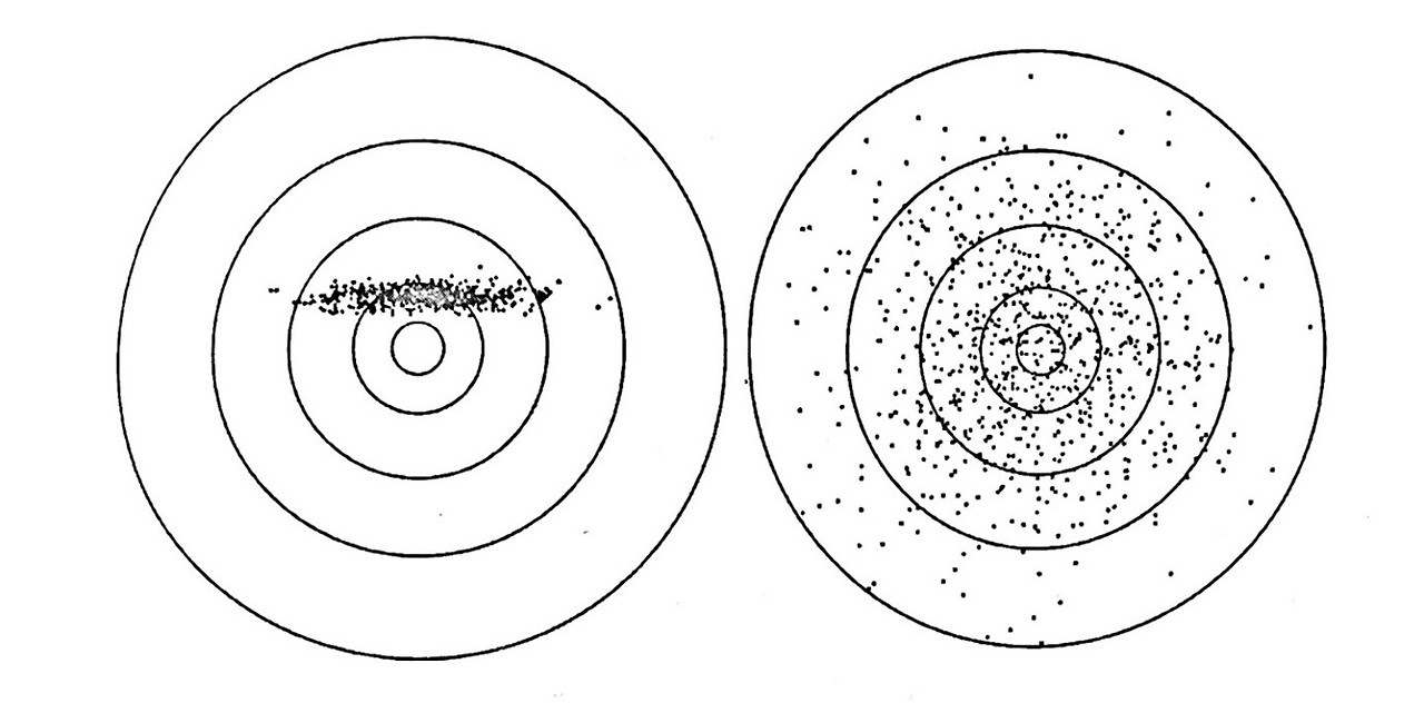 아래 도해를 봅시다. 정상적인 상태의 두 사람이 그림의 표적판에 사격하는 경우를 가정해 봅시다. 왼쪽은 극명한 편향성을 보입니다. 이는 에러(실패)가 있음을 의미합니다. 다만 오른쪽 사람에 비해 표적의 중앙에 더 가까이, 균일하게 총알을 보냈습니다. 오른쪽의 표적은 넓게 분산된 양상을 보입니다. 여기에서는 에러(실패)가 의심되지 않습니다. 하지만 동시에 이후 중앙 가까이에 총알을 집중시키려 한다면 어려움을 겪을 것이 분명합니다. 일반적으로 편향과 분산은 어느 한쪽을 높이면 다른 쪽이 낮아지는 특성을 갖습니다. 불확실성이 높은 세계에서는 왼쪽의 전략이 우월합니다. 즉 명확한 실패/실수를 할 때 더 좋은 결과가 나타날 수 있습니다. 실패/실수에 대한 비용 손실이 적고 그 실패가 놀라운 발견으로 이어지는 경우에는 더욱 그렇습니다.