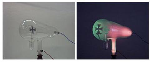 [그림] 전원을 넣기 전(좌)의 음극선관(Crookes Tube)과 고전압이 흐를 때(우)의 모습. 음극선이 유리관에 부딪힐 때 녹색의 형광빛이 나오는 것을 볼 수 있습니다. 유리관에 십자가 모양의 그림자가 생기는 것으로 음극선이 일반 금속을 투과할 수 없음을 보여줍니다. ⓒ 위키피디아