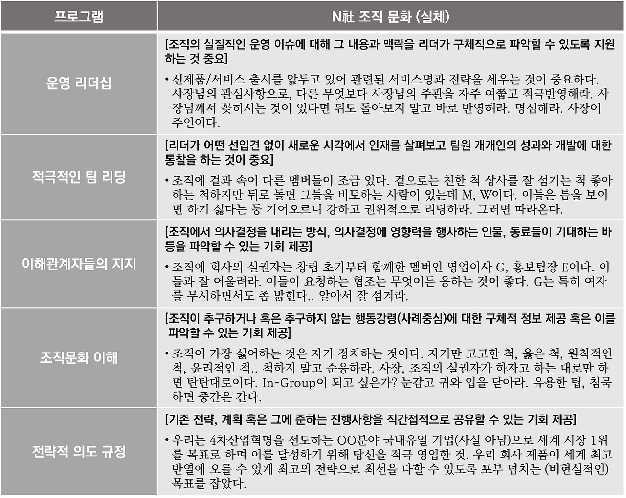 아래는 N社의 공식 비전과, 앞 글 ‘경력직 채용, 그 태도에 관하여II’에서 제시드린 통합/온보딩을 위한 두가지 프로그램 프레임워크에 위같은 가정을 반영해 N社 조직의 실체적 문화를 적용한 것입니다. (아래 표의 디테일 내용을 꼭 읽어봐주시기 바랍니다.)