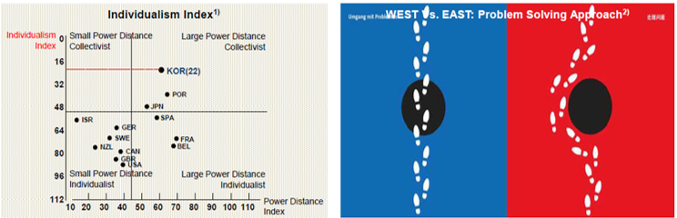 더욱이 우리나라의 집단 문화는 여전히 리더십의 권위에 강하게 의존하고, 또 집단적이며, ‘문제’를 직접 대면하는 것을 꺼리는 경향을 가지기에.(아래 그림 참조) 조직 차원에서 ‘메타인지’를 발휘한다는 것은 구조적으로 어려운 일이 되고 말았습니다.