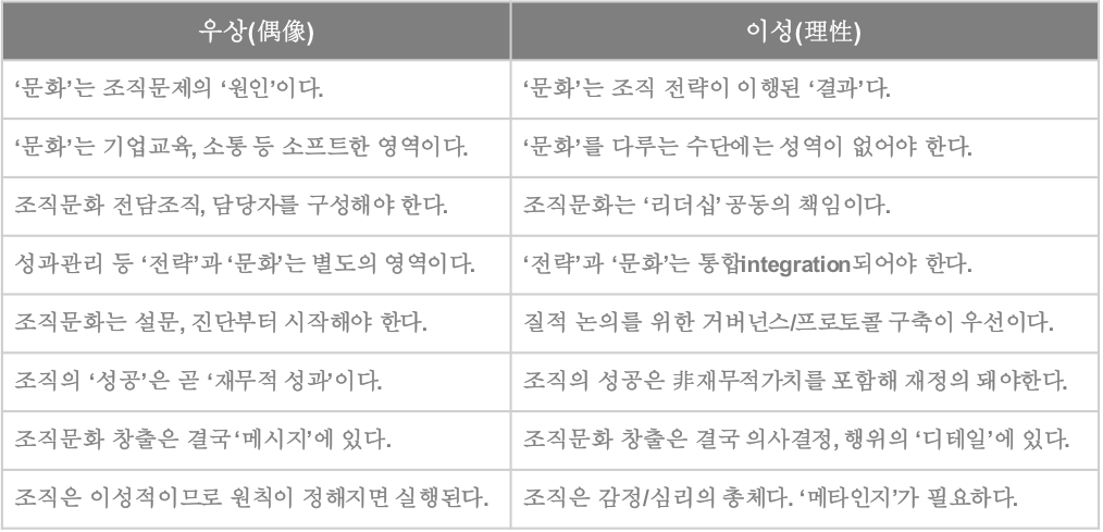 이러한 인식에 따르면 결국 조직문화는 전자에 비해 뒷전이 될 수 밖에 없다. 만약 전자 - 기업의 가시적 성장, 재무적 목표에 초점을 맞추고 이를 조직에 강력히 요구하며 이행하는 일련의 조직운영 과정 - 으로 인해 부정적인 조직 문화 징후가 발견된 것이라 해도, 이 기업은 전자를 수정할 수 없다. '전략'이 '문화'를 우선할 수 없기 때문이다. 때문에 조직문화는 언제나 '부분적'으로 다뤄지며, '시스템'에 대한 접근은 제한된 채 변화의 초점을 구성원 개개인에게 돌리는 것이다.