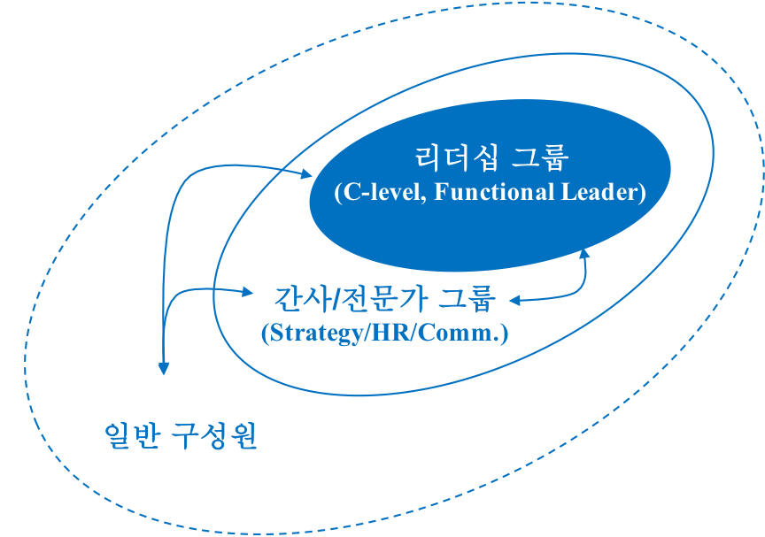 간사그룹은 통상적으로 조직전략을 담당하는 COO(Chief Organizational Office) 산하 HR 조직이 담당하되, (조직)성과관리/평가 체계 등 기획을 담당하는 실무 리더와 구성원 교육/소통을 담당하는 실무 리더를 간사로 지정해 ‘조직문화’에 대한 논의가 조직 운영의 ‘구조’적 개선부터 ‘적응’과정까지 유기적으로 다뤄 질 수 있도록 설계해야 한다. 혹 기업이 조직운영의 실무 영역에서 외부 전문가 그룹을 활용하고 있다면, ‘전문가 그룹’을 핵심 논의 과정에서 참여시켜 ‘객관적’ 관찰자 및 ‘전문가’로서의 시사점을 제공하고 간사그룹을 도와 논의 그룹이 아젠다를 충분히 이해하고 효과적인 대안을 제시할 수 있도록 유도해야 한다.