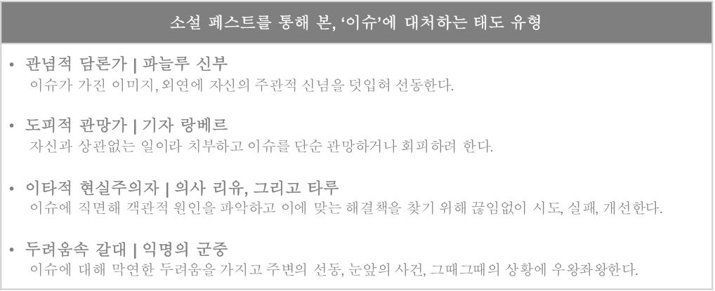 ‘우리는 파늘루 신부인가, 랑베르인가, 리유와 타루인가, 아니면 불특정 다수의 ‘갈대’ 같은 군중인가?’