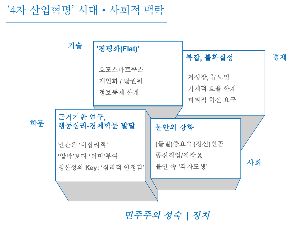 한편 4차산업 혁명 시대의 학문적 ‘사조’ 중 하나인 ‘근거 기반의 연구’에 따라, 우리가 그간 맞다고 인식하거나 행했던 것들에 오류가 있음이 ‘실증’되기 시작했다. 행동경제학은 ‘인간은 합리적이다’라는 고전 경제학의 가정을 무너뜨렸다. 심리학은 ‘의미’가 ‘압박’보다 인간을 동기부여 시킴을 밝혔다. 구글은 ‘아리스토텔레스’라는 연구 프로젝트를 통해 인간의 생산성을 결정하는 가장 중요한 것이 ‘심리적 안정감’이라는 뜻을 밝혀냈다. ‘심리적 안정감’은 곧 ‘문화’다.