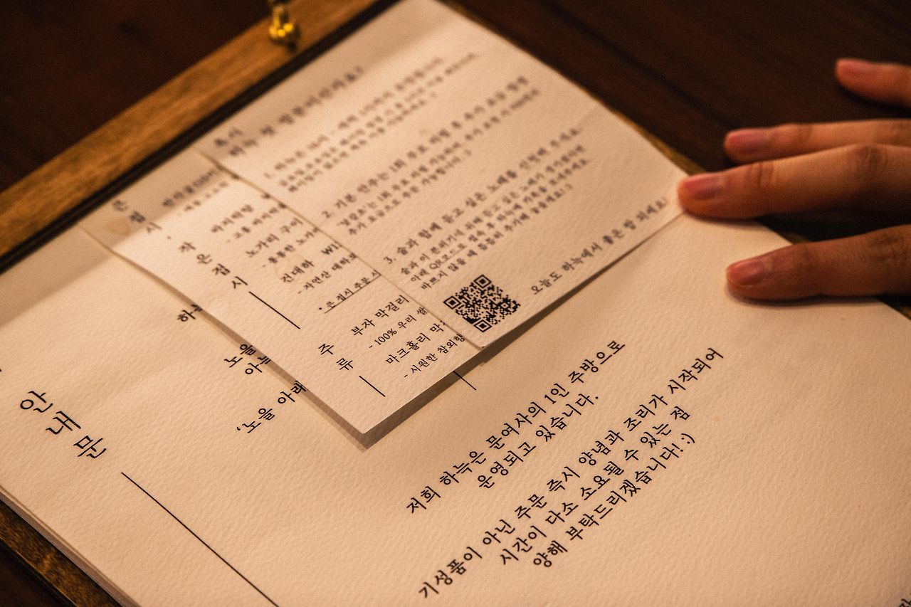 이 공간에는 모든 표기, 메뉴판과 메뉴 설명까지 직관적이면서도 쉽게 이해할 수 있도록 전부 한글로 표기하고 있다. 외국어, 외래어를 사용하지 않는 이유는 남녀노소 이용하기 편하도록 하기 위함이다. 메뉴판에는 QR코드를 통해 노래를 신청할 수 있게 되어있어 좋아하는 노래를 주제로 이야기를 이어갈 수 있는 분위기를 만들었다.