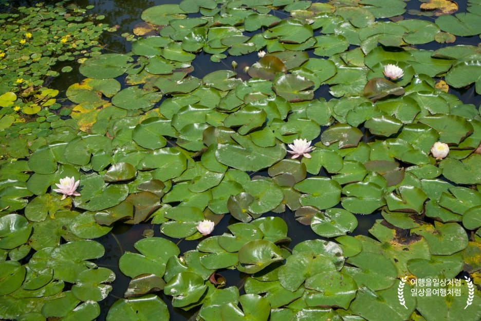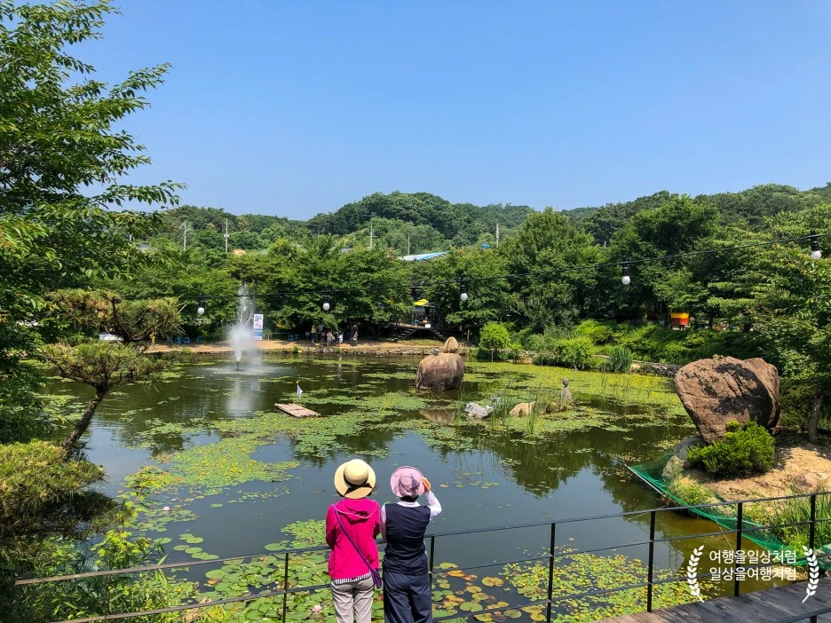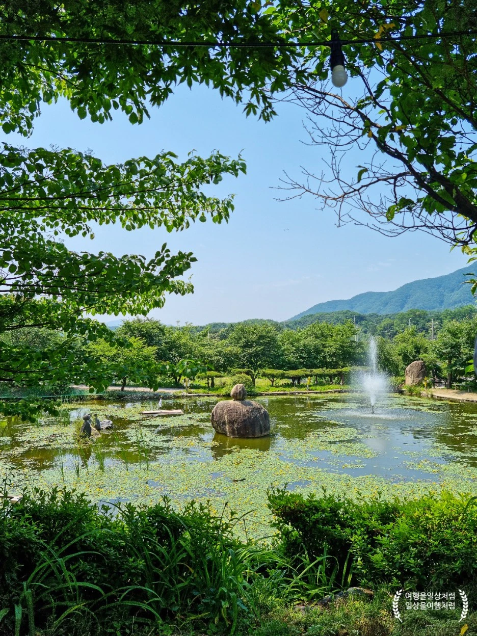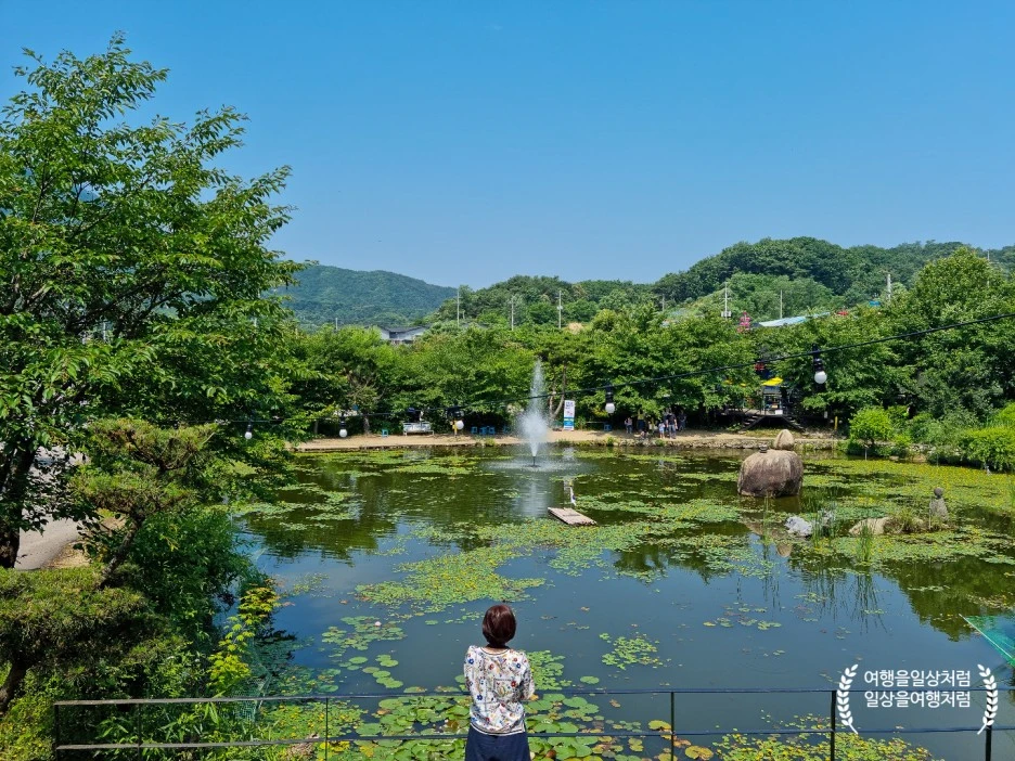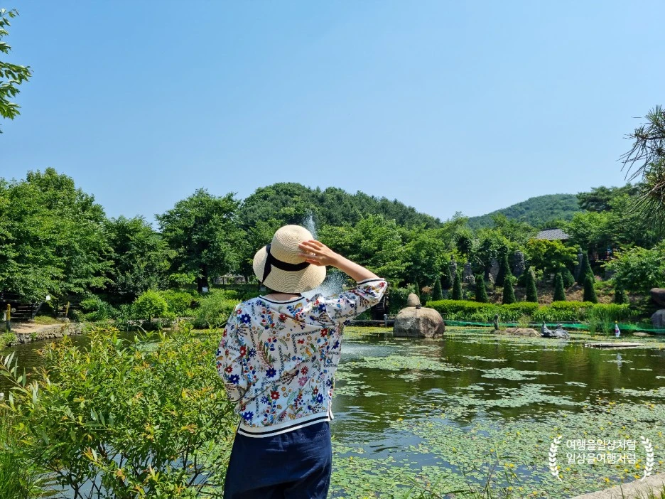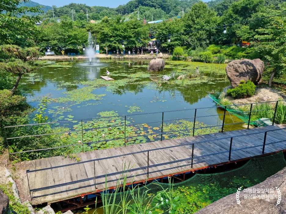 아침도 먹었겠다 소화도 시키고 산책할 겸 해서 어제 못 돌아본 펜션 주변을 둘러보기로 했다. 카누로 커피 한잔하고, 바로 밖으로 나갔다. 이 펜션을 선택한 이유 중에 하나가 펜션 입구 쪽에 위치한 호수가 정말 근사했기 때문이다. 인공 분수가 나오고 연꽃이 좌르르 펼쳐지는데 여기가 명당이구나 싶었다.