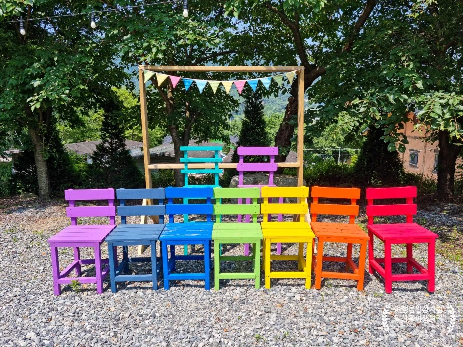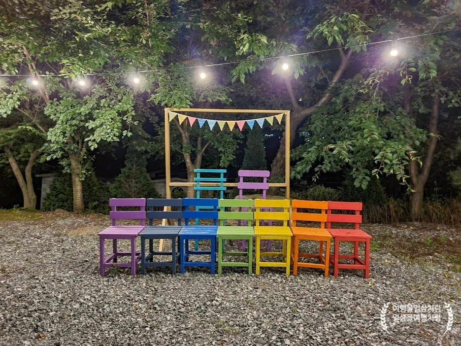 야외에 수영장도 있어서 지금은 약간 추워서 못 놀았지만 아이와 함께 오면 간단하게 물놀이하기도 괜찮겠다는 생각이 들었다. 조명을 밝히니 야외가 더 이뻐지는 느낌이라서 트레이드 마크로 보이는 무지개 의자도 한 컷.