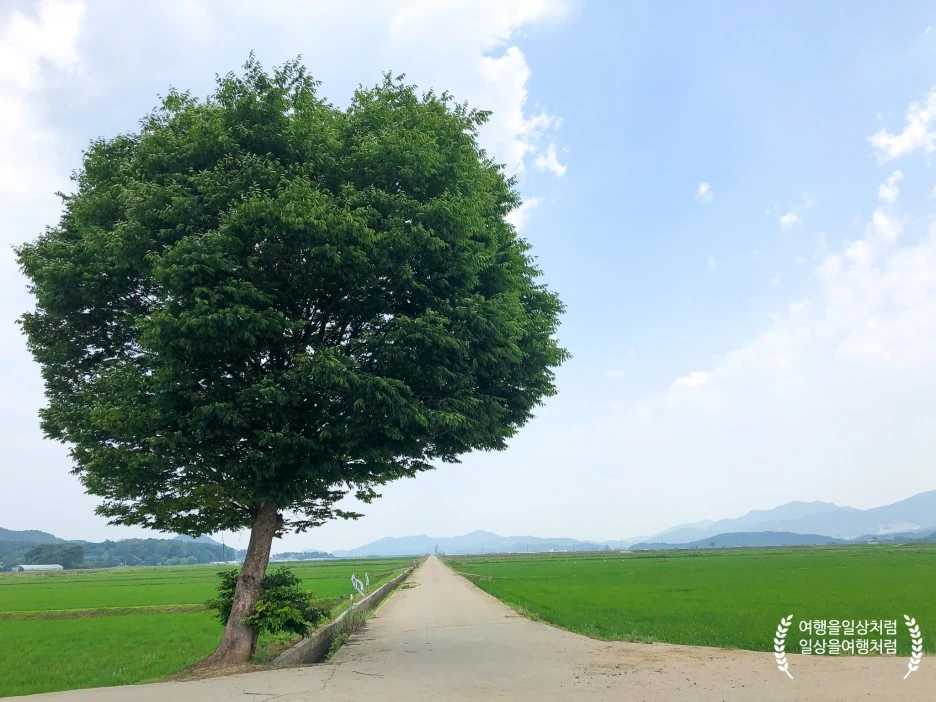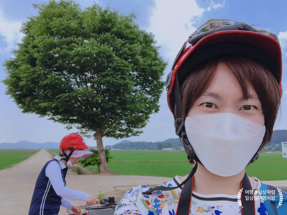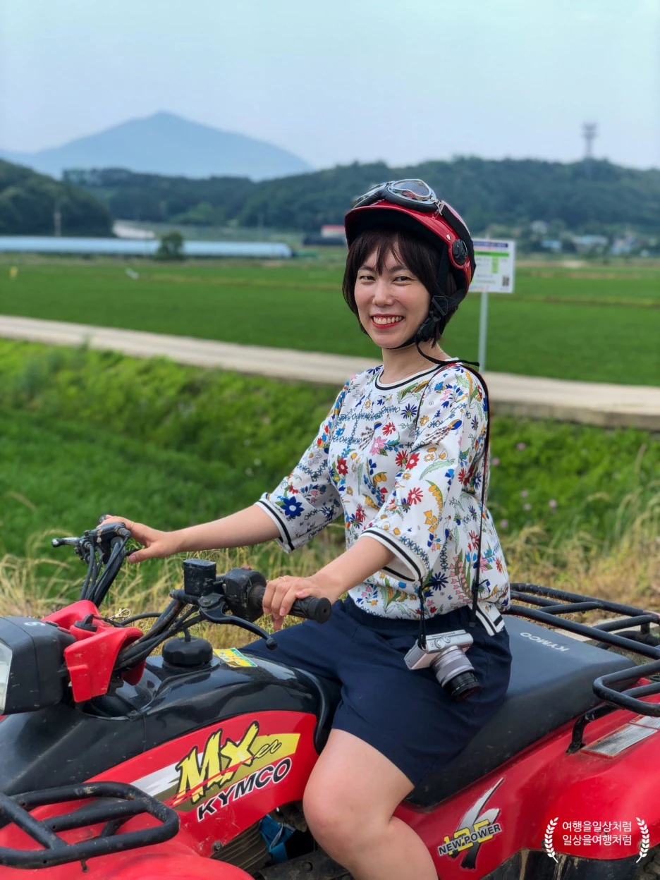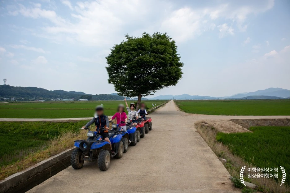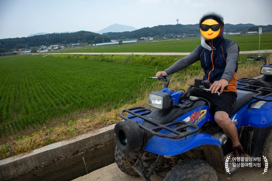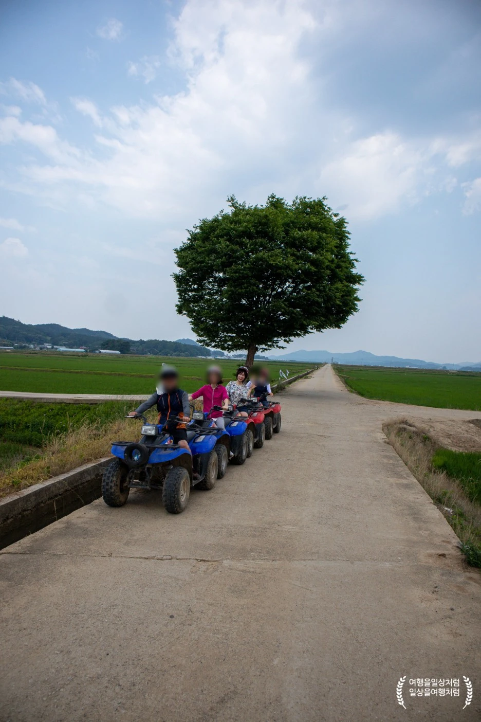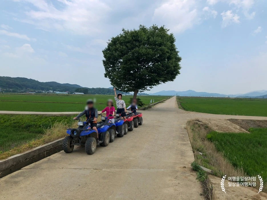 아무리 작은 크기여도 엔진을 가지고 전동으로 움직이는지라 위험한 행동은 절대 하면 안 되고 지시에 잘 따라와야 한다고 사장님께서 거듭 강조하셨다. 설명이 끝난 후에는 5바퀴 정도를 돌면서 감을 익히고 실전으로 나갔다. 도로로 나가서 논을 따라 질주를 하는데 풍광이 너무 아름다워서 여러 번 멈추고 싶었다. 특히 논길 사이에 덩그러니 위치한 엄청나게 큰 나무의 존재가 빚나서 그 옆에서 사진을 많이도 찍었다. 다음 코스는 산이었는데
