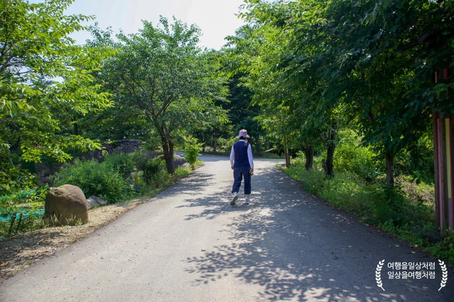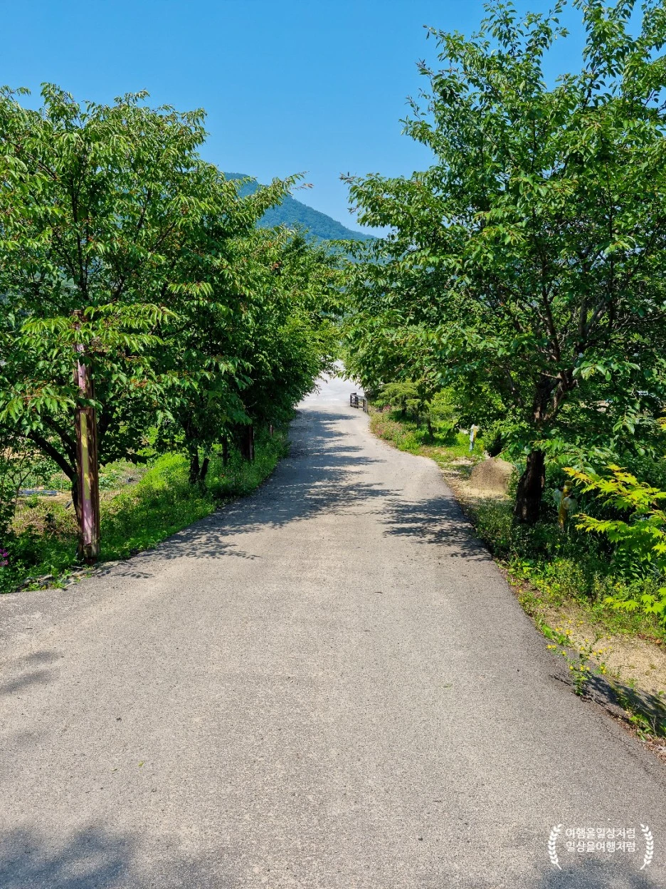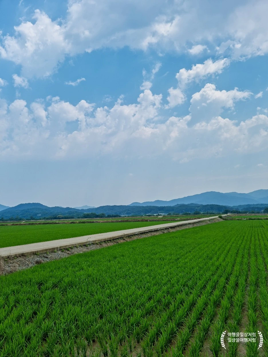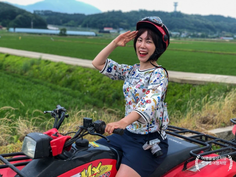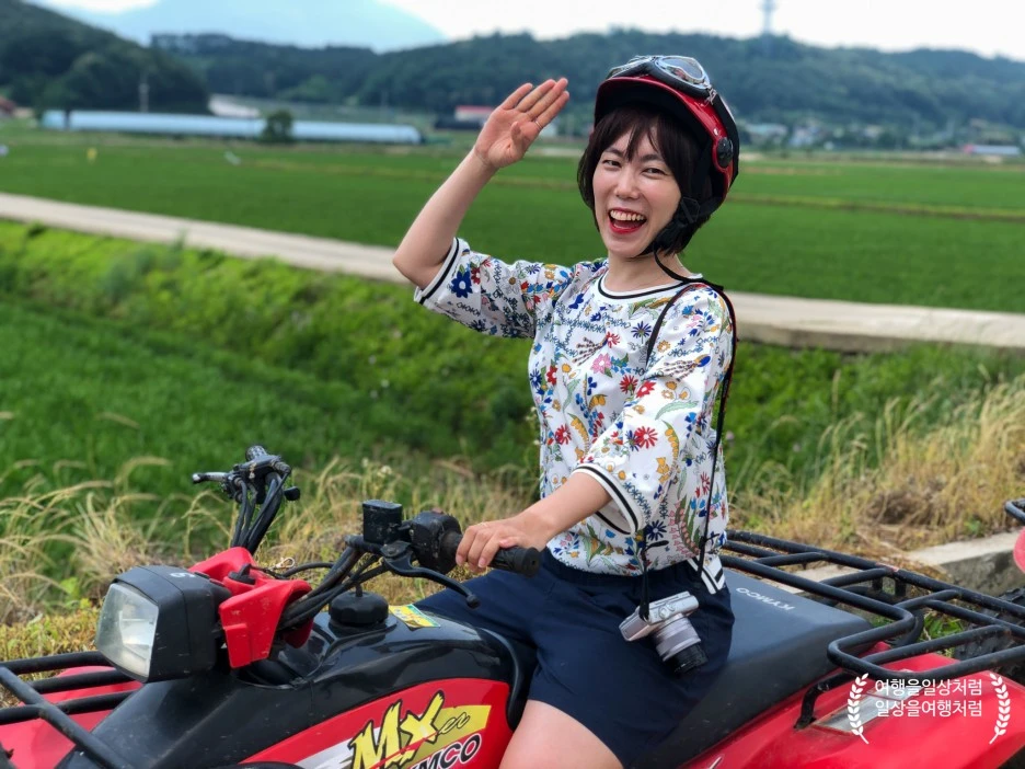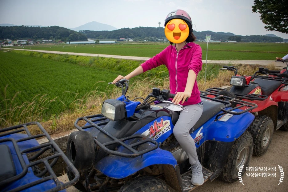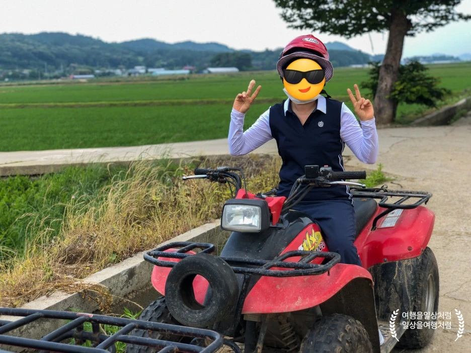 아무리 작은 크기여도 엔진을 가지고 전동으로 움직이는지라 위험한 행동은 절대 하면 안 되고 지시에 잘 따라와야 한다고 사장님께서 거듭 강조하셨다. 설명이 끝난 후에는 5바퀴 정도를 돌면서 감을 익히고 실전으로 나갔다. 도로로 나가서 논을 따라 질주를 하는데 풍광이 너무 아름다워서 여러 번 멈추고 싶었다. 특히 논길 사이에 덩그러니 위치한 엄청나게 큰 나무의 존재가 빚나서 그 옆에서 사진을 많이도 찍었다. 다음 코스는 산이었는데