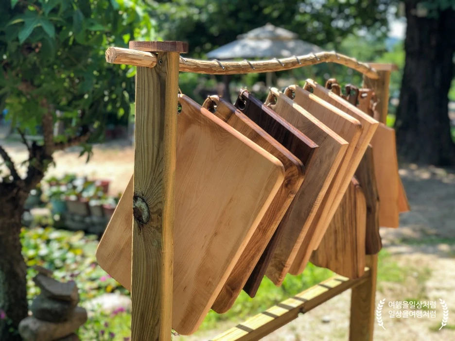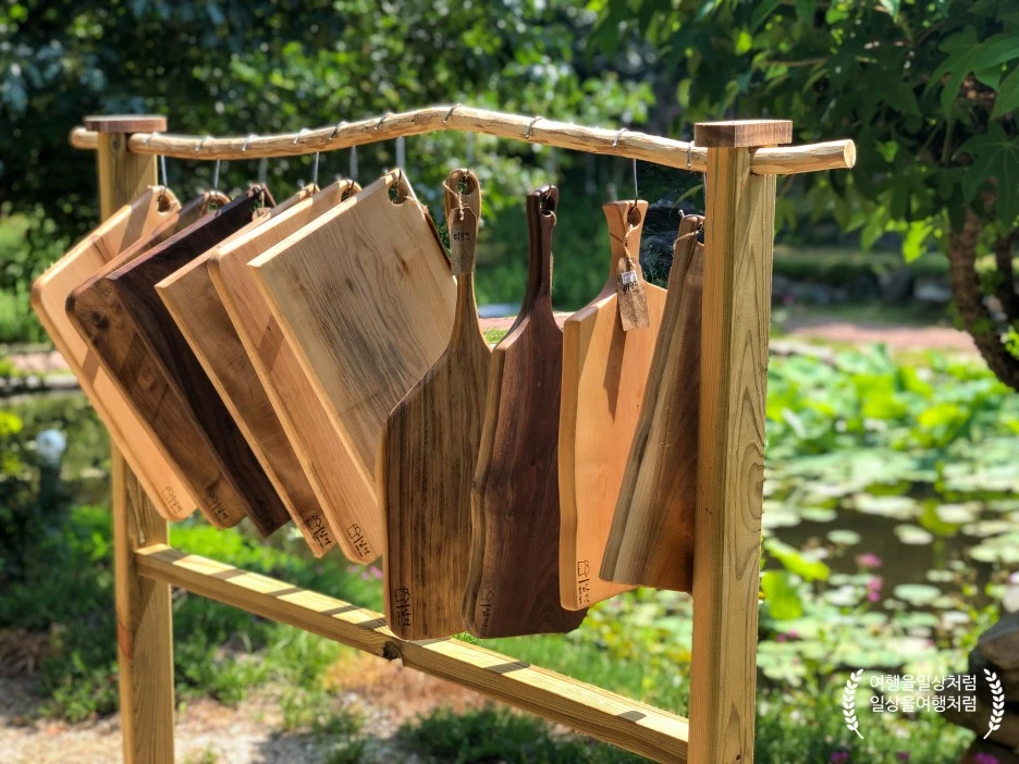 사장님께 여쭤보니 여름이 지나고 이번 가을부터 공방 체험도 직접 하실 예정이라고 설명해주셨다. 왠 큰 창고가 있나 하고 지나갔던 곳이 공방이었다. 10가지 나무 중 좋아하는 것을 선택해서 도마 만드는 체험도 준비하고 계신다고 하셔서 조심스레 혹시 어떤 도마를 만드는지 여쭤봤더니 공방 체험에 사용할 샘플용 도마를 종류별로 다 꺼내서 보여주셨다.