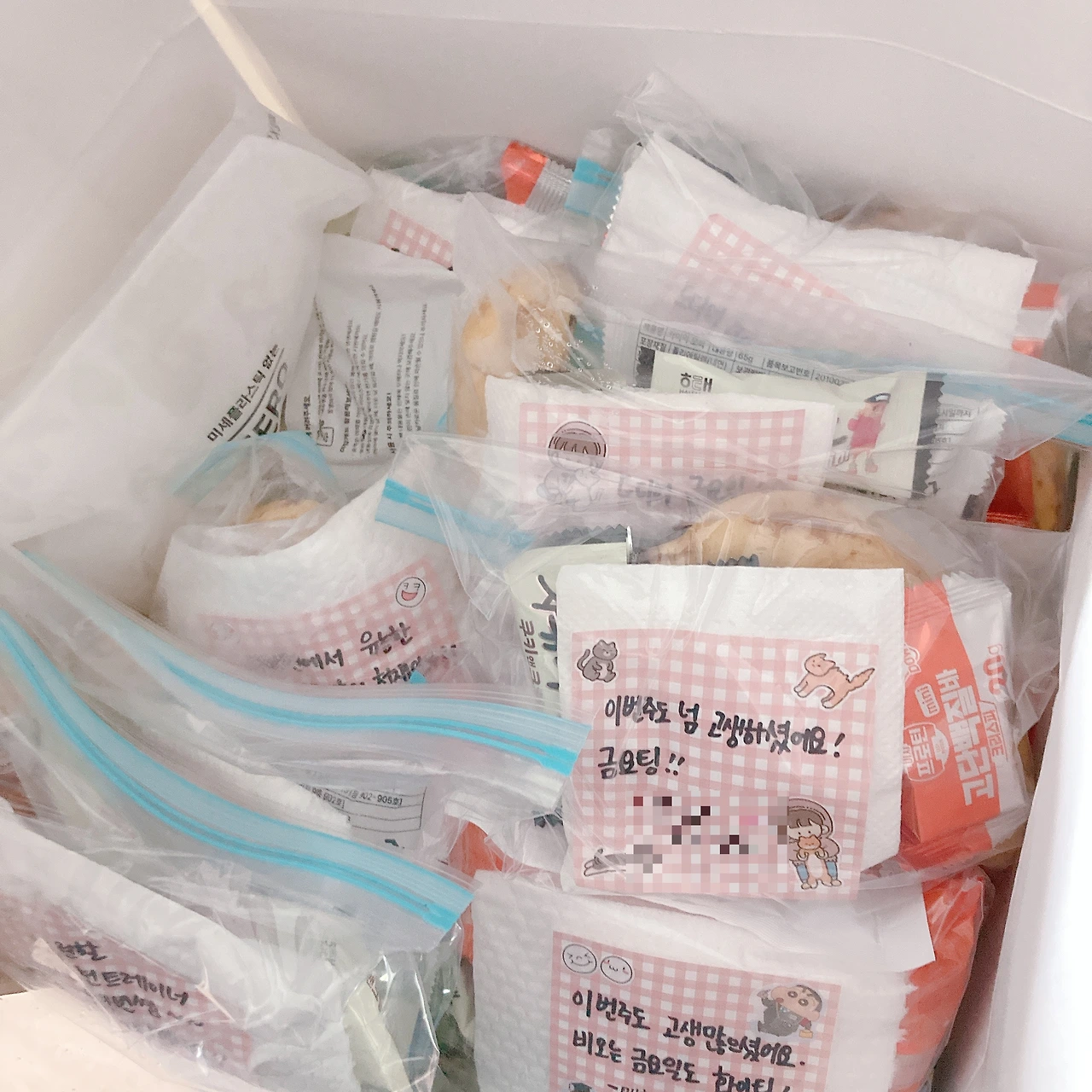 집으로 돌아와 도시락을 싸고, 쌤들에게 드릴 것들을 챙기느라 분주했다. 잔뜩 선물 받은 카이막 모찌를 나누고 싶었지만, 성의 없이 모찌만 건네고 싶진 않았다. 금요일, 가장 피곤할 직장인들을 위해 응원의 메시지와 함께 작은 간식 꾸러미를 만들었다.