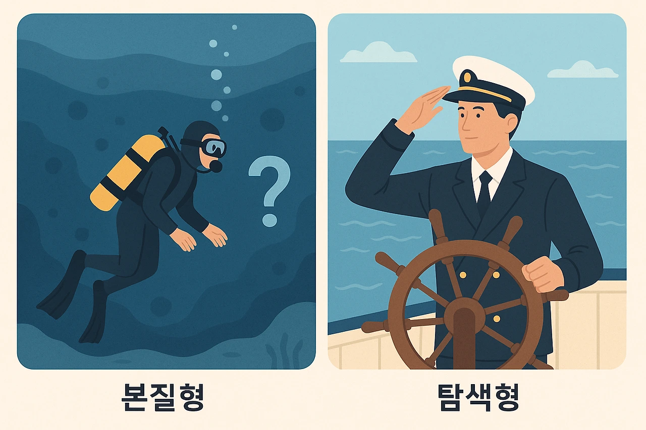 반면 탐색형은 넓은 바다 위를 자유롭게 항해하는 선장과 같다. 다양한 분야를 넓게 아는 잡학다식형으로, 새로운 아이디어를 연결하고 융합하는 능력이 탁월하다. 유연하게 사고하며 창업, 마케팅, 예술, 기획, 네트워킹 분야에서 빛을 발한다. 하지만 깊이 파고드는 힘은 상대적으로 약해, 지식이 얕아질 수 있다는 단점도 있다.