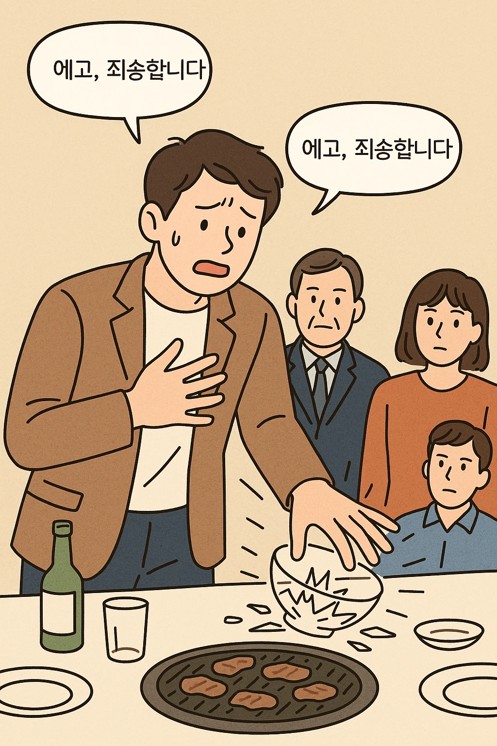 사장님까지 참석한, 다소 긴장된 분위기의 회식 자리. 나는 고기를 굽다가 동료에게 접시가 필요하다는 걸 눈치챈다. 센스 있게 접시를 챙기러 일어나지만, 순간 손이 미끄러져 옆에 있던 유리그릇을 와장창 깨뜨린다. 엄숙했던 자리가 단숨에 얼어붙고, 모든 시선이 나에게 향한다. 나는 연신 “에고, 죄송합니다”를 외치며 허둥지둥 수습한다.