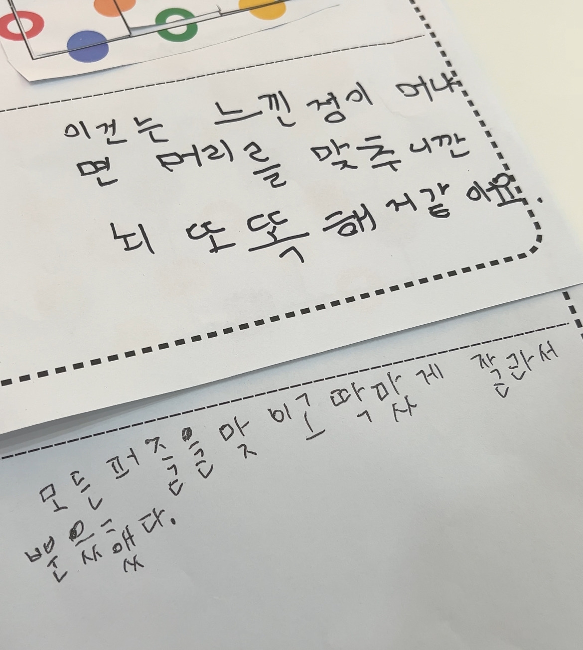 때로는 글을 쓰다가 점검하려는 나를 발견하거나, 발행해야 하는 글을 쓰다가 막히는 순간에는 "아! 글은 이렇게 써야 하는 거구나!"하고 깨닫게 한 초등학교 1학년 아이가 쓴 글을 가끔 찾아본다. 이 글을 보고 나면 글을 쓰는 것에 대한 두려움이 사라진다.
