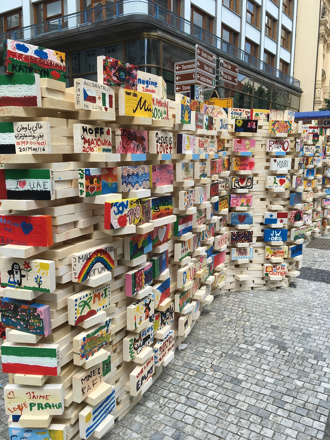 벽돌을 사서 기부한 사람은 누구든 원하는 경우 그림이나 글씨 등 다양한 페인팅을 할 수 있다. 사진에 뒤쪽으로 보이는 작은 키오스크에서 기부를 위한 벽돌과 페인팅을 위한 재료들을 준비해 놓고 있다.