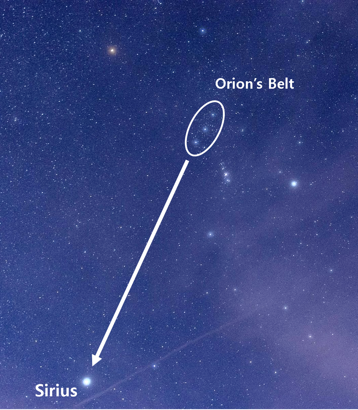 우선 겨울밤하늘에서 오리온자리를 찾아보자. 오리온자리는 별자리의 대부분이 밝은 별로 이루어져 있다는 점, 장구 모양이라는 점, 그리고 오른쪽 어깨가 붉은 별(베텔게우스)이라는 점 등 두드러지는 특징이 많아 금방 찾을 수 있을 것이다. 오리온자리를 찾았다면 삼태성이라고도 불리는 오리온의 허리띠를 찾아보자. 오리온자리의 가운데에 나란히 세 개의 별이 줄지어 있는데 이 세 별들을 연결한 선을 밑으로 주욱 내려 보자. 오리온의 뒤를 따르는 유독 밝은 별 시리우스를 만날 수 있을 것이다.