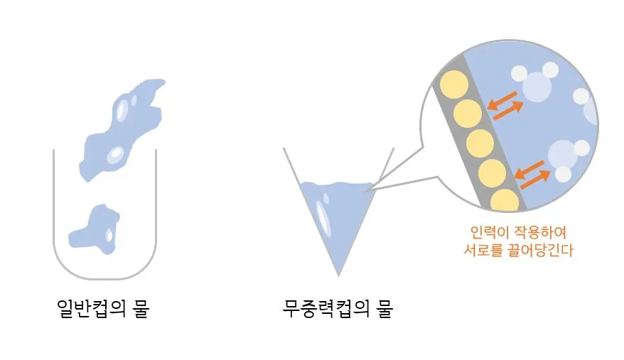 원리는 간단하다. 밑이 넓어 물이 담기지 못하는 일반 컵에 비해 밑이 좁게 모아지는 무중력 컵은 물이 좁은 곳으로 모아지면서 컵의 플라스틱 표면과의 인력으로 물 전체를 붙들어 잡을 수 있다. 다만 음료를 따를 때에 벽면을 타고 천천히 흘려 넣어야 한다.