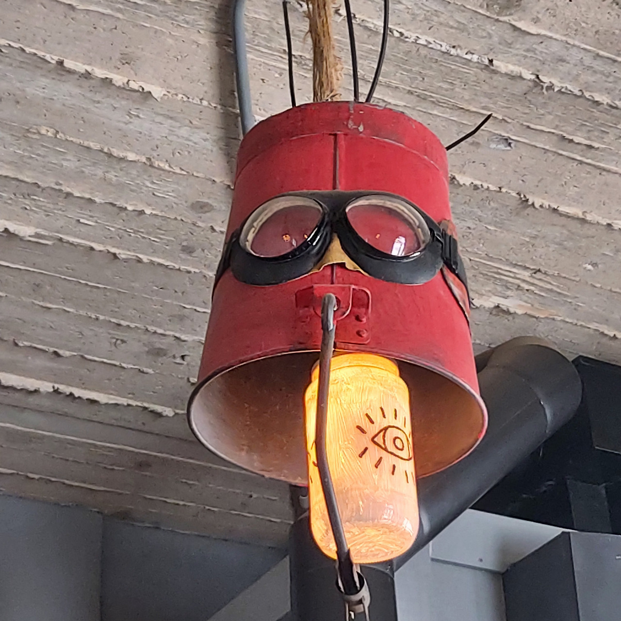 재즈풍의 음악과 투박한 나무탁자와 의자들, 창가의 선반에 놓인 책들, 천장에 매달려 돌아가는 빨간 프로펠러와 특이한 모양의 전등들.