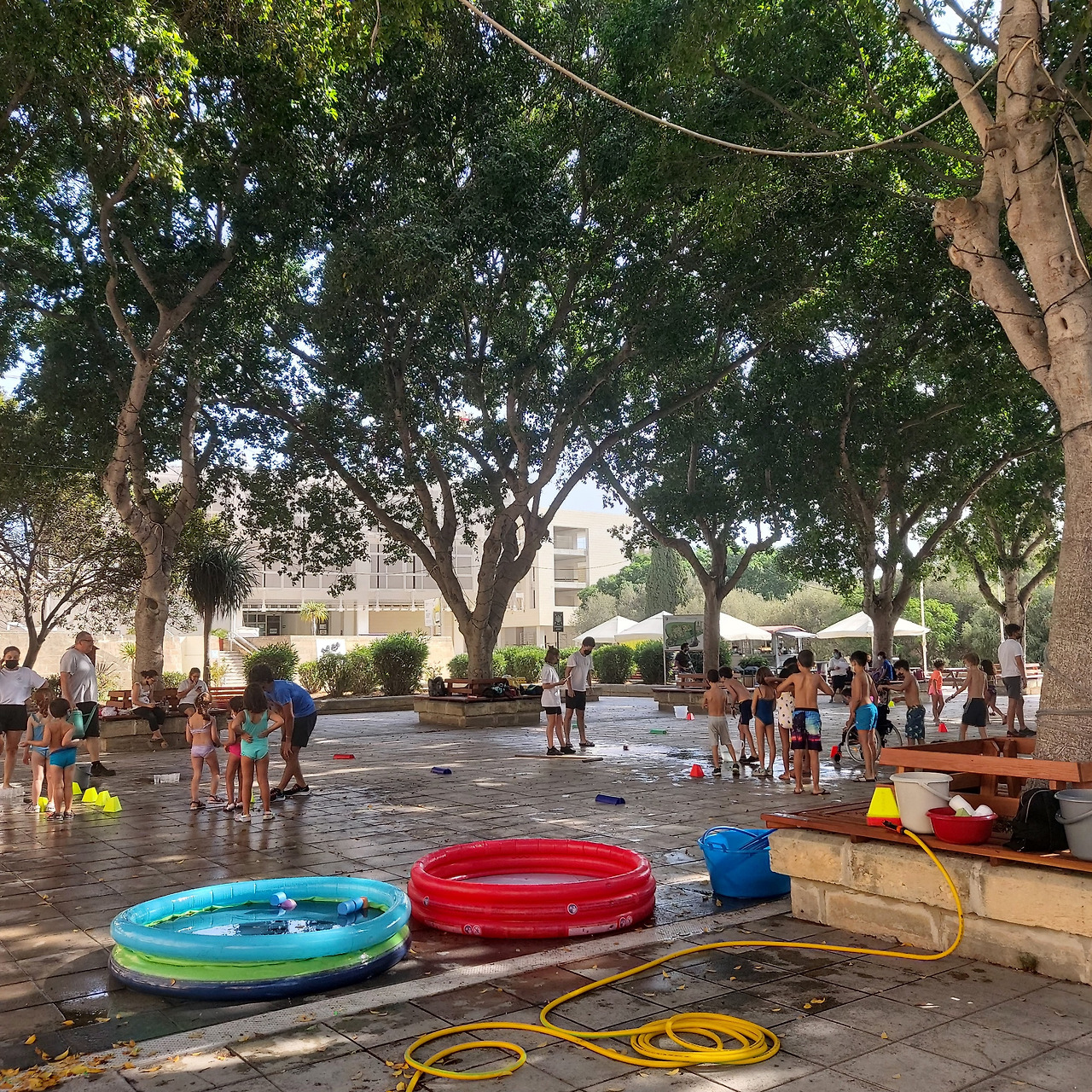도서관과 카페 앞의 넓은 광장에서는 수영복을 입은 아이들이 신나게 놀이를 하고 있다.