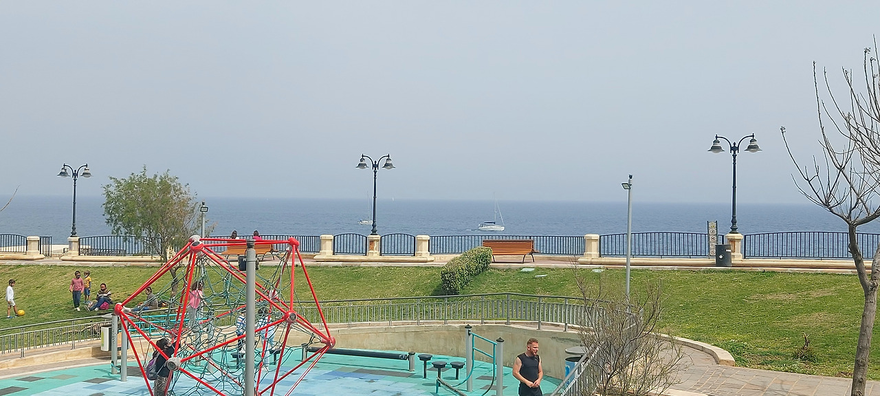 바다와 마주 보고 있는 곳에는 아파트들이 옆으로 길게 늘어서 있다. 그 앞의 작은 놀이터에서 아이들이 재잘거리며 놀고 있다. 영어는 아니고 몰타어(약간 이탈리아어 같다)로 들린다.