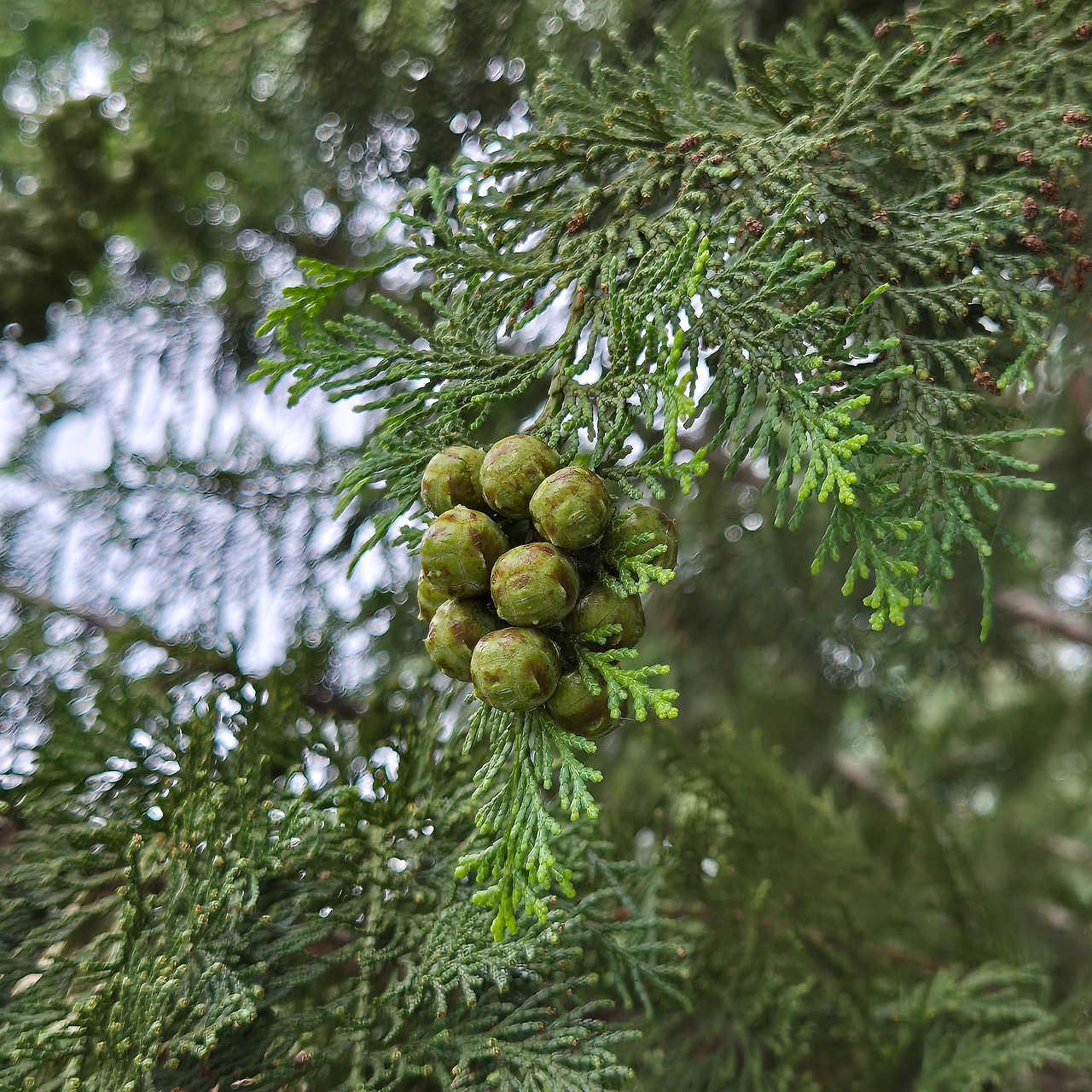 석정온천 옆 산기슭의 편백 열매