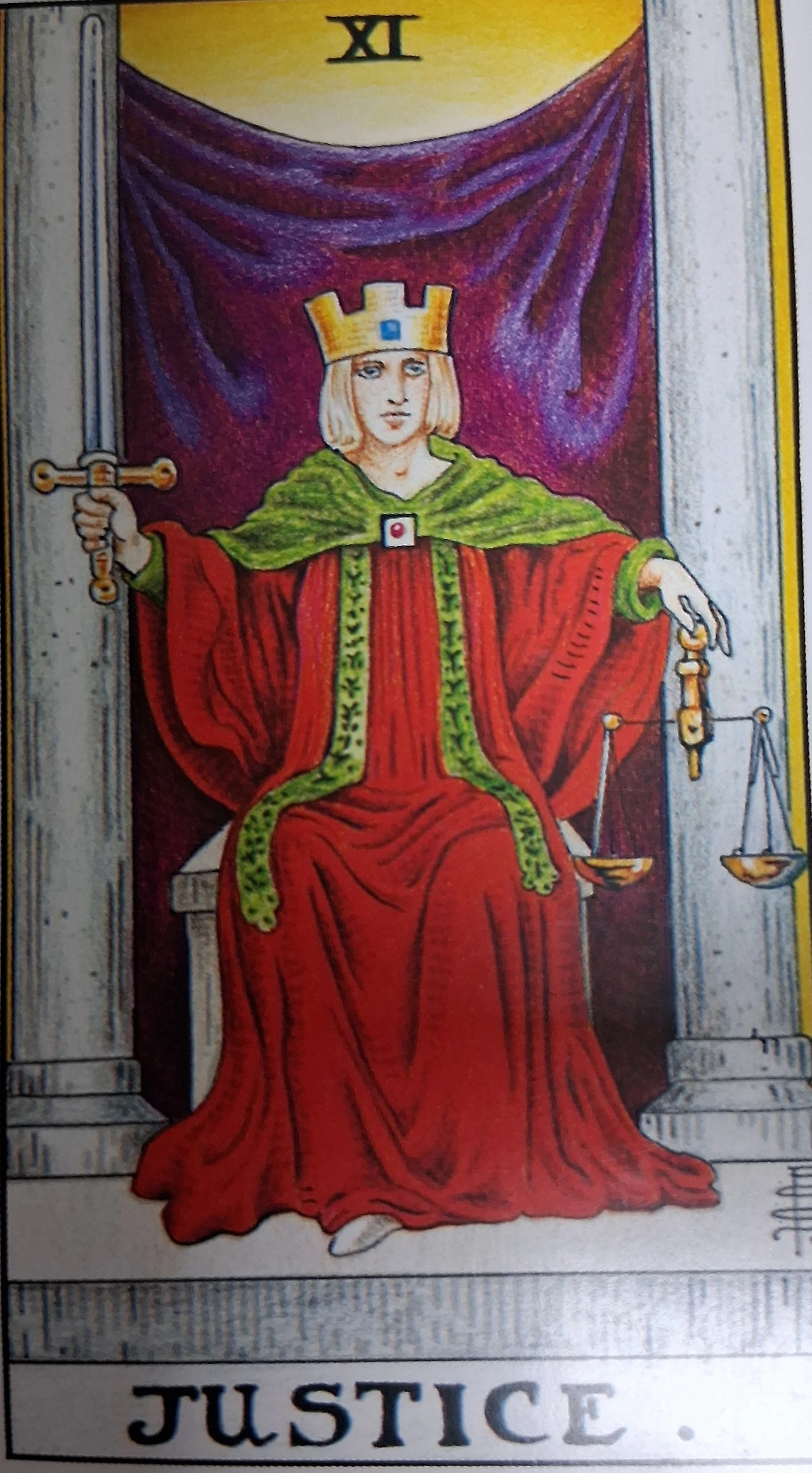 이 카드는 균형, 진실, 책임, 그리고 참나로서의 올바름을 가리킵니다.