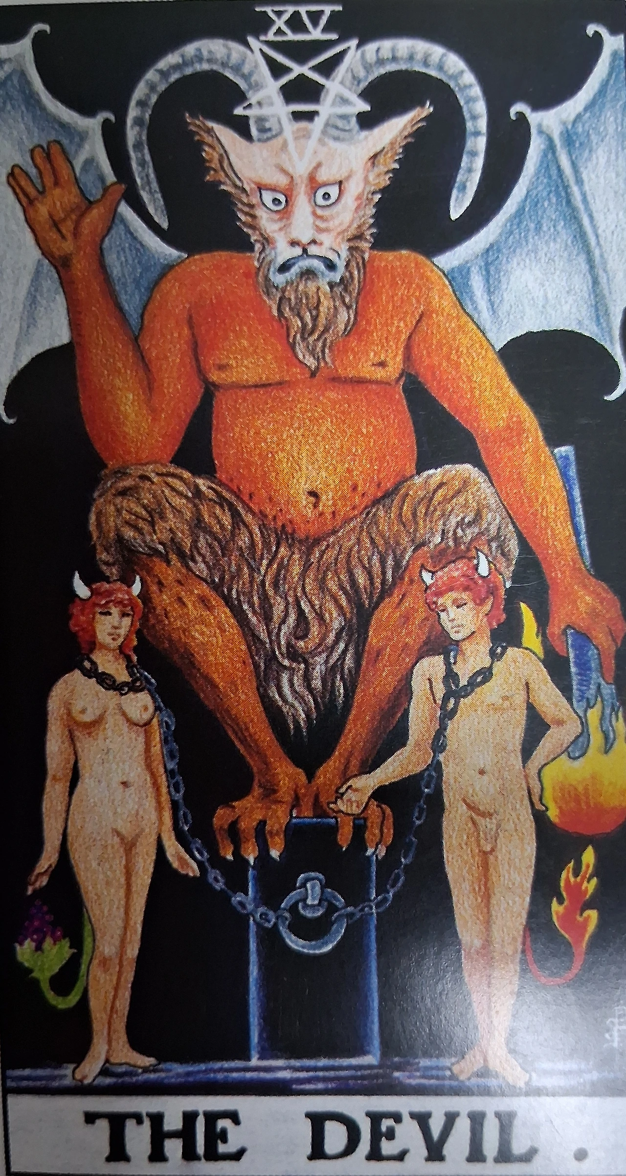 악마는 박쥐 날개와 염소 뿔을 지녔으며, 손에는 거꾸로 된 횃불을 쥐고 있습니다.
