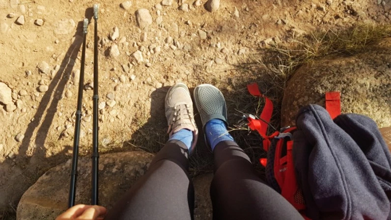 돌길에 크록스가 살짝씩 미끄러지길래 왼쪽 발만이라도 안정감을 주고자 잠시 등산화로 갈아신었다.