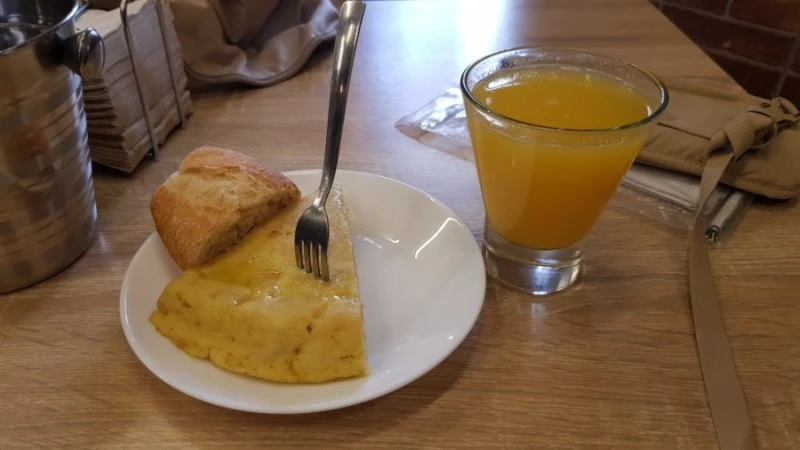 또르띠아와 오렌지 주스. 또르띠아는 속에는 감자고 위에는 계란이 덮여있는 요리다.