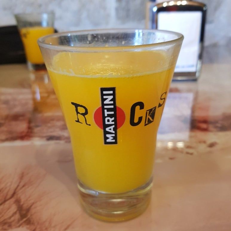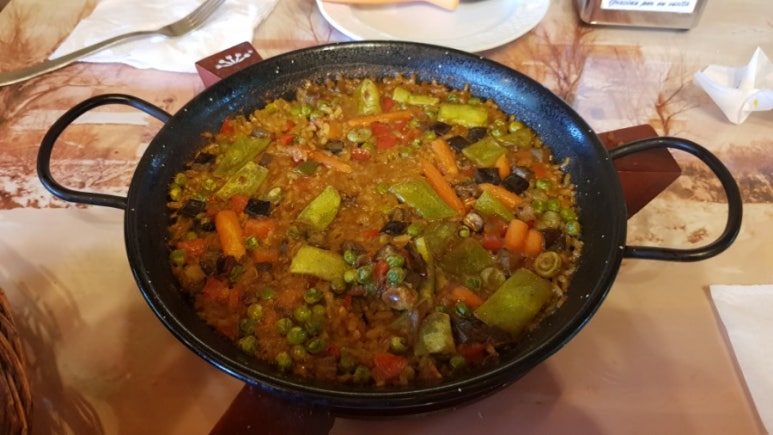 나는 생과일 오렌지 주스와 빠에야를 주문했다.