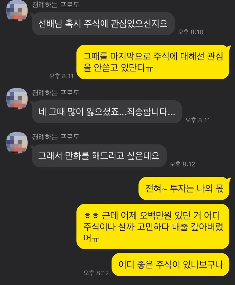늘 스마트폰으로 주식을 달고 사는 이 후배 A는 주식으로 하루에 몇 백씩 벌기도 하기에 씀씀이가 컸다. 그동안 주식에 대한 조언도 몇 차례 해주었지만, 내 입장에선 주식에 호되게 당했던지라 어리석은 나를 깨닫게 해 준 비용으로 삼고 주식은 남의 이야기로 치부한다 했었다.