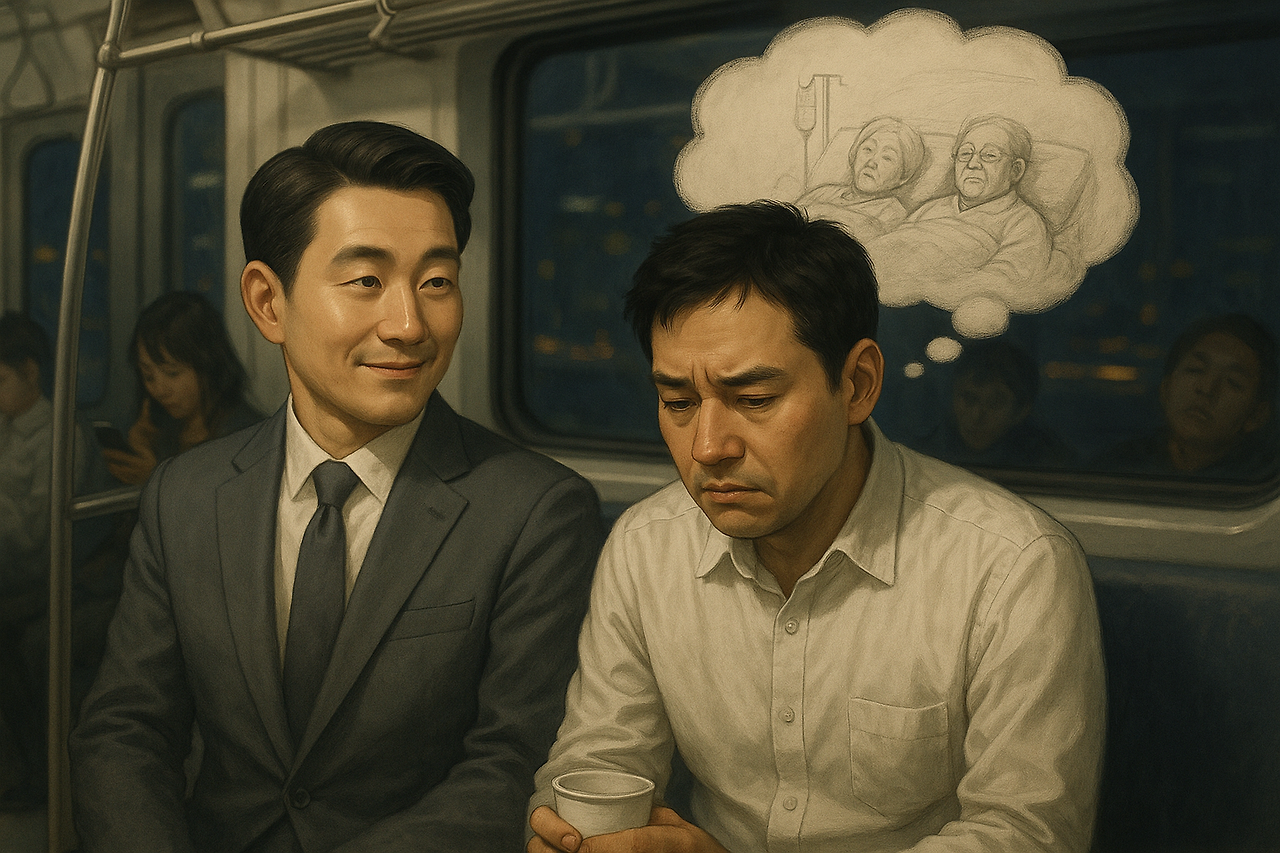 퇴근길, 지하철 창문에 비친 내 얼굴은 지쳐 있고, 어깨는 축 처져 있다. 옆자리 직장인들의 피곤한 얼굴 위로 부모님의 희미한 웃음이 겹쳐 보인다. '나는 왜 이 모양일까, 왜 해줄 수 있는 게 없을까.' 자책감과 무력감이 온몸을 휘감는다. 부모님의 나약함 앞에서, 자식으로서의 책임감과 현실적인 무력감, 미안함을 느낀다. 지하철을 기다리며 어머니와의 짧은 통화를 마친다. 어머니도 빨리 끊자고 하신다. 내 부담감과 미안함 때문일까, 지하철의 소음 때문일까. 에휴. 근데 문득 뒤에 서있던 남자가 어깨를 툭툭 두드린다.