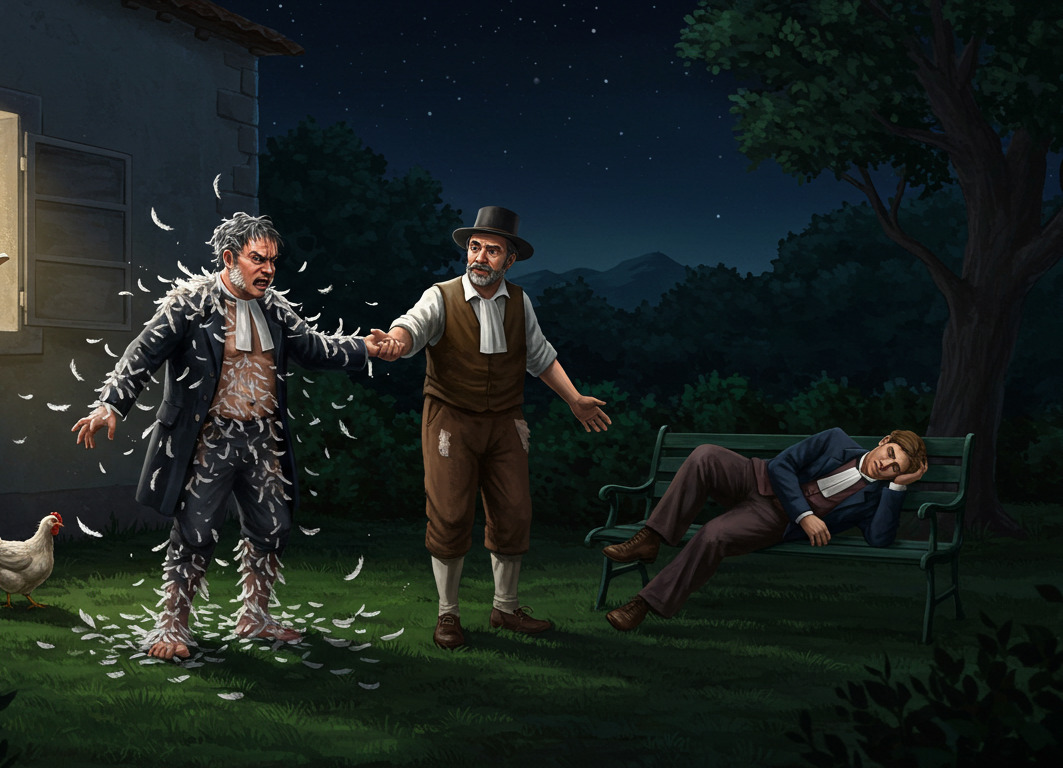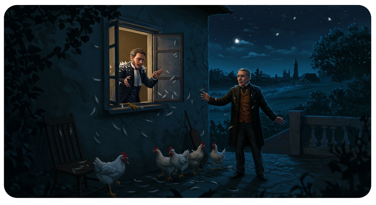 (닭의 목을 쥔 채 창가에 등장하여) 친구, 우리가 잘못 온 것 같아. 이런 닭들은... 아마도 내가 착각한 모양이야. 제기랄, 여기저기서 날뛰는군, 이 저주스런 놈들! (모자를 벗어 날뛰는 닭들을 쫓는다.)