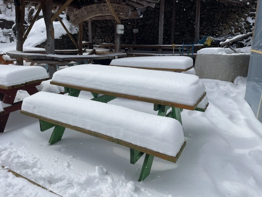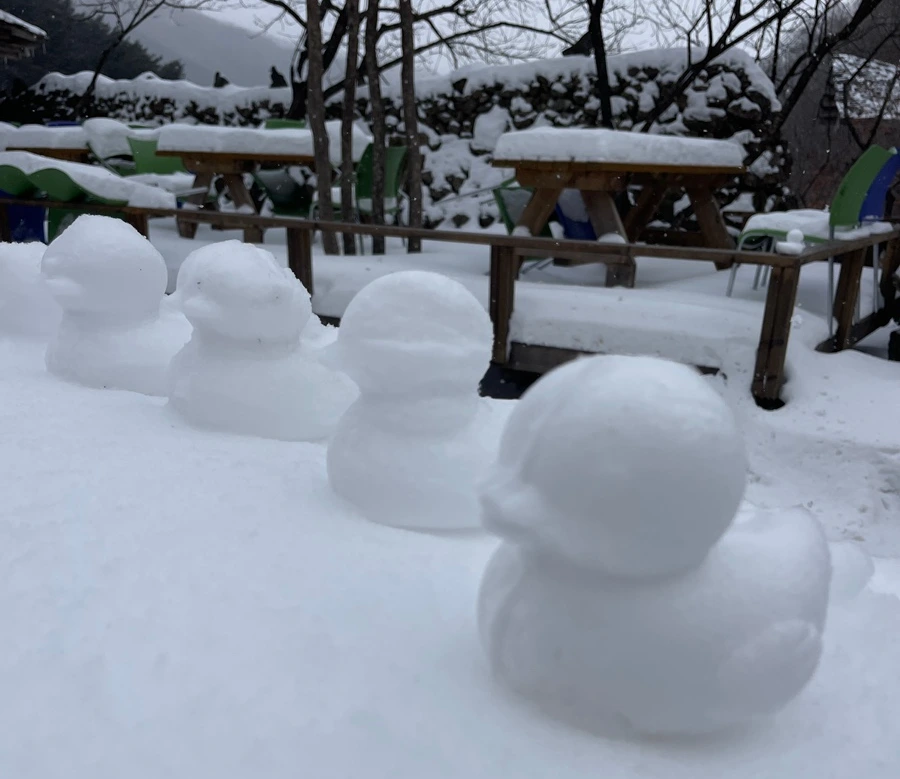 벤치에 눈이 쌓여 봉긋하게 솟아오른 눈을 보며 남편에게 외쳤다.