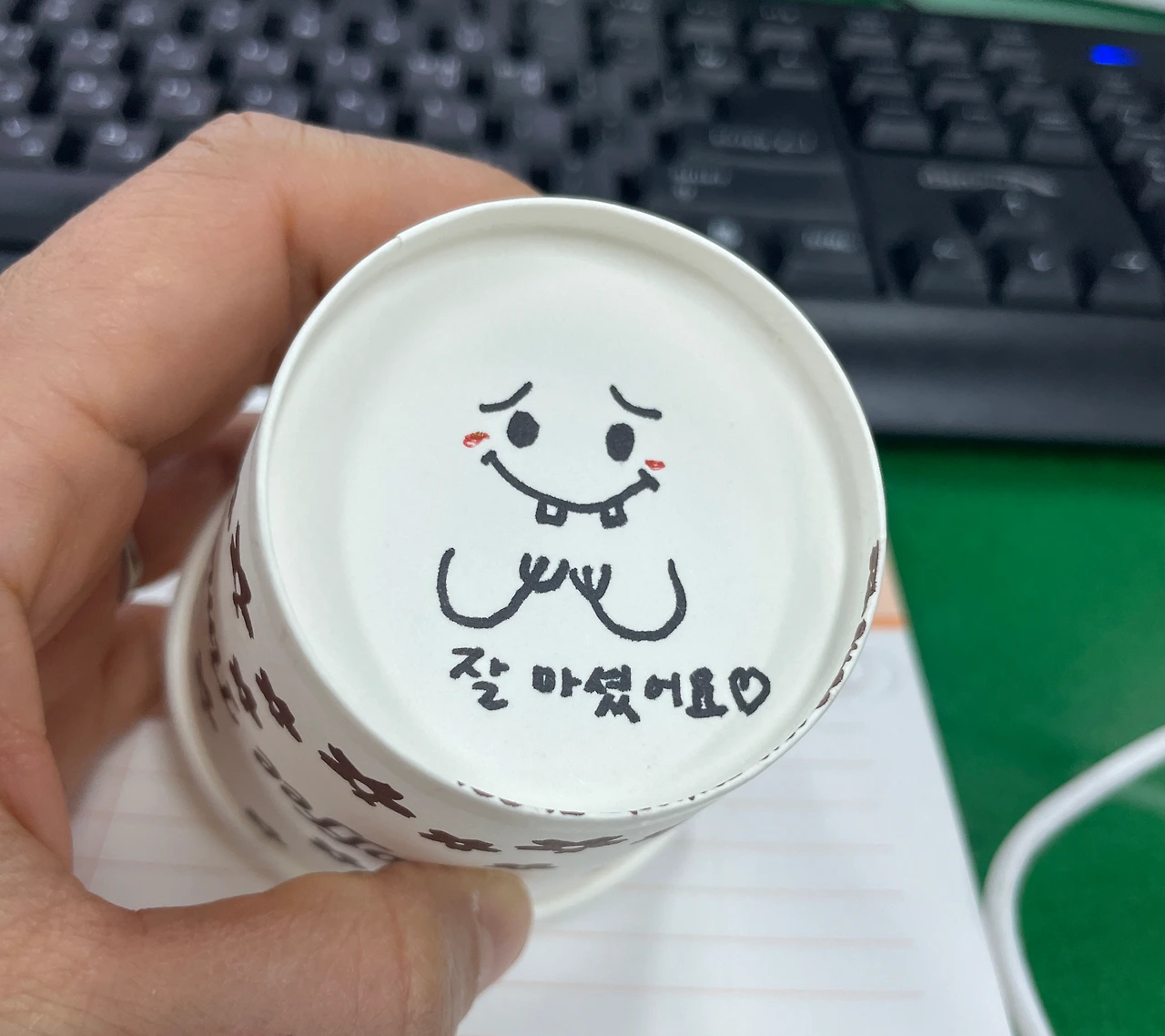 네모난 책상과 네모난 의자에 앉아 있는 어른들의 몸을 깨우기란 여간 쉽지 않다. 오늘은 먼저 마음을 깨워보련다. 동료가 타준 맛있는 커피를 다 먹고 나서 난데없이 컵을 뒤집어본다. 냅다 눈, 코, 입을 그린다. 빠알갛게 볼터치까지 해서 동료에게 건네니 씨익 웃는다.