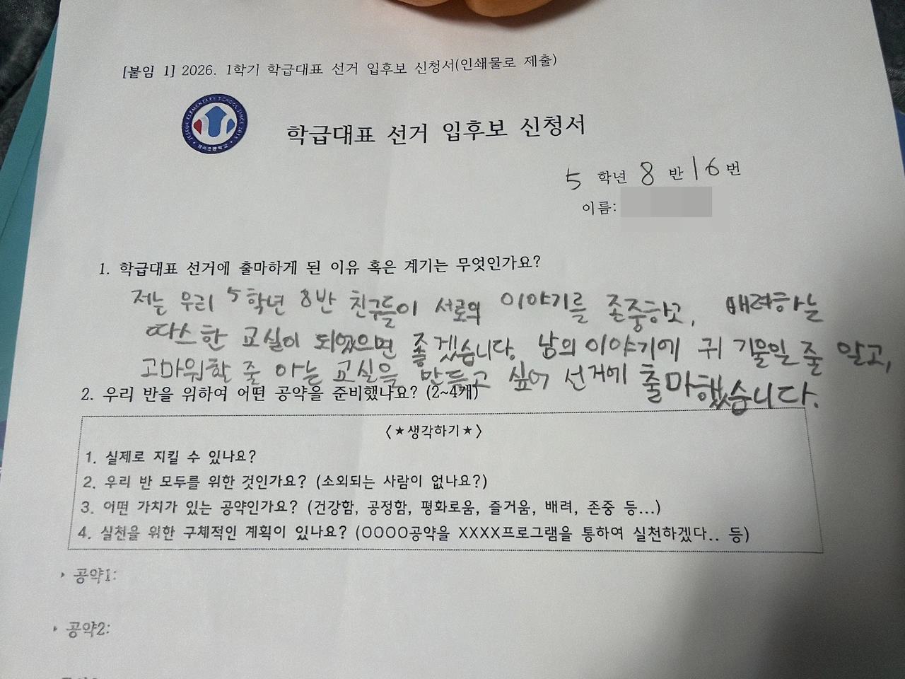 아이는 주말 내내 선생님이 나눠준 학급 대표 선거 입후보 신청서를 붙잡고 앉아 있었다. 출마하게 된 계기와, 학급을 위한 공약을 적는 칸이 있었다.